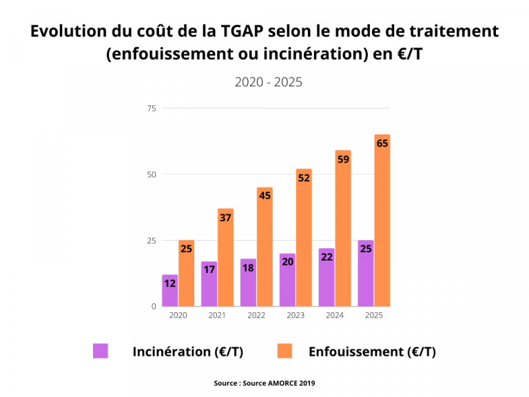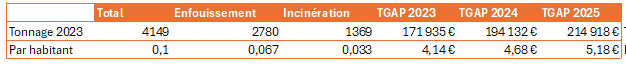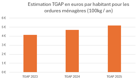 Un rapide calcul sur la base des chiffres de l’évolution des coûts de la TGAP et en considérant un tonnage constant laisse apparaître une augmentation de la TGAP de 1 euro par habitant entre 2023 et 2025 pour les ordures ménagères.